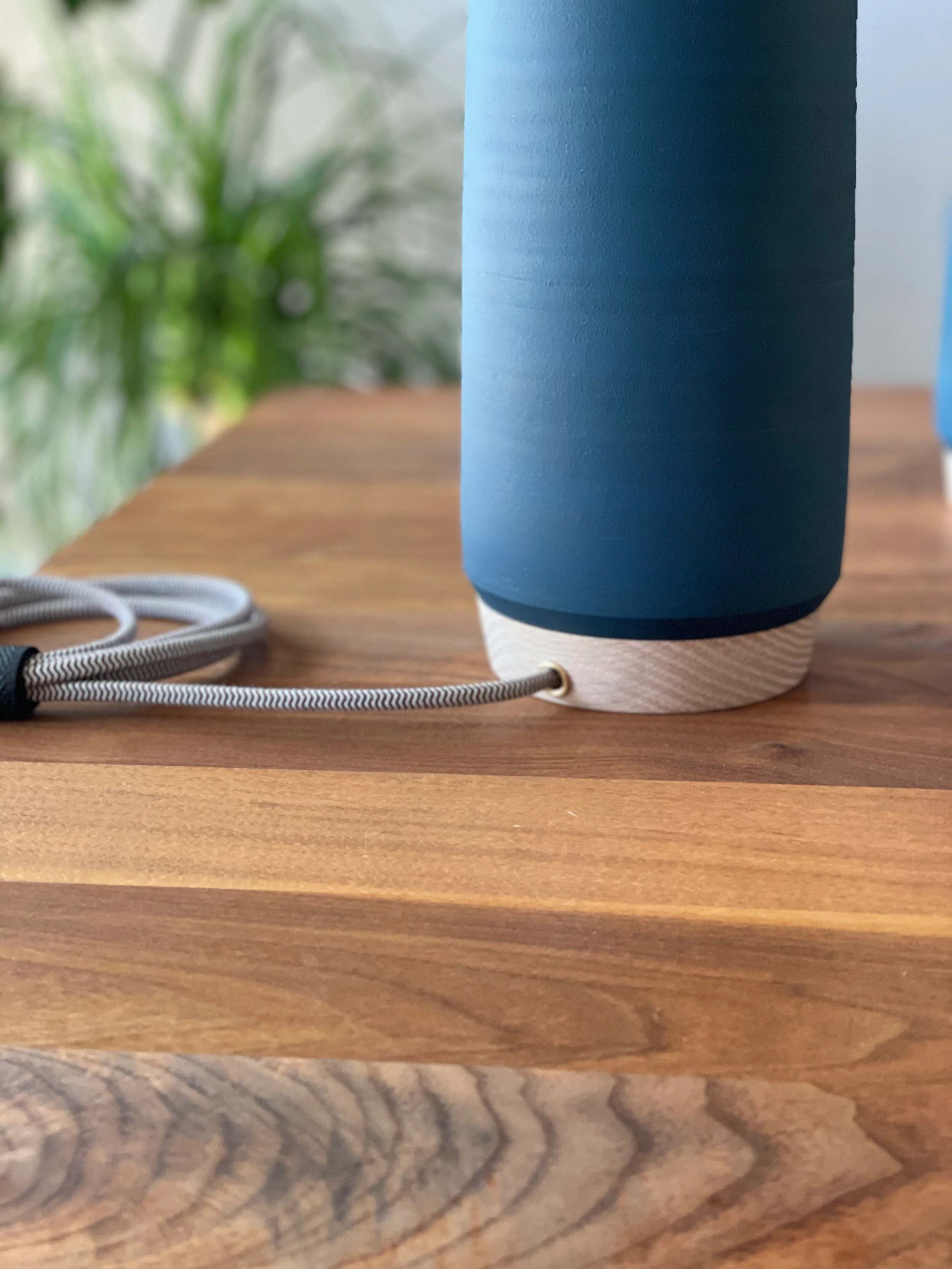 The matte navy underglaze offers a unique finish on this modern form. Finished with white washed white oak, this unique lamp brings a touch of sophistication to any space.Â