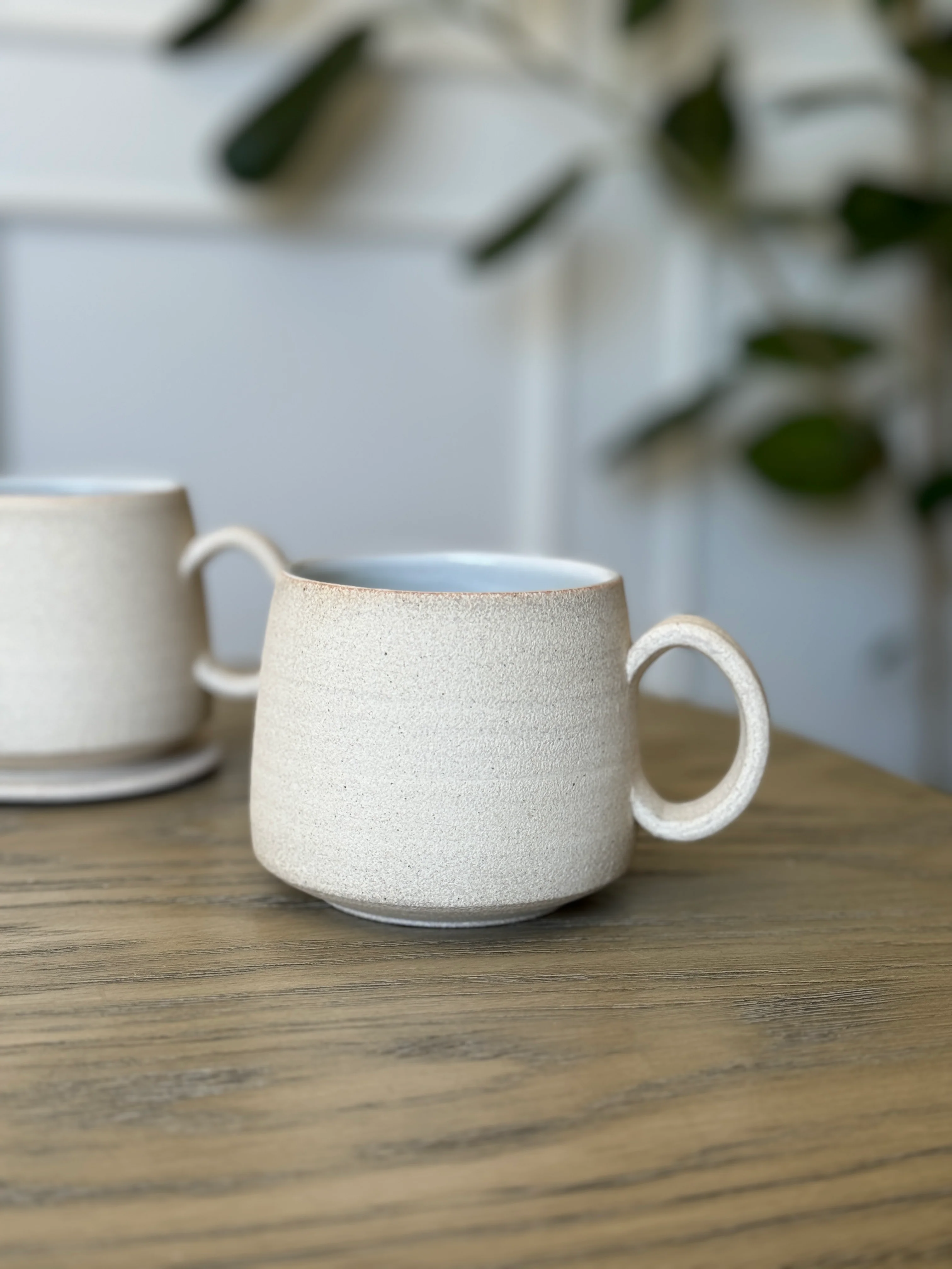 A raw stoneware coffee mug made in collaboration with Brooke Wagner Design. Hand-thrown on the potters wheel and finished with a glossy white interior. Holds 12-13oz. comfortably.