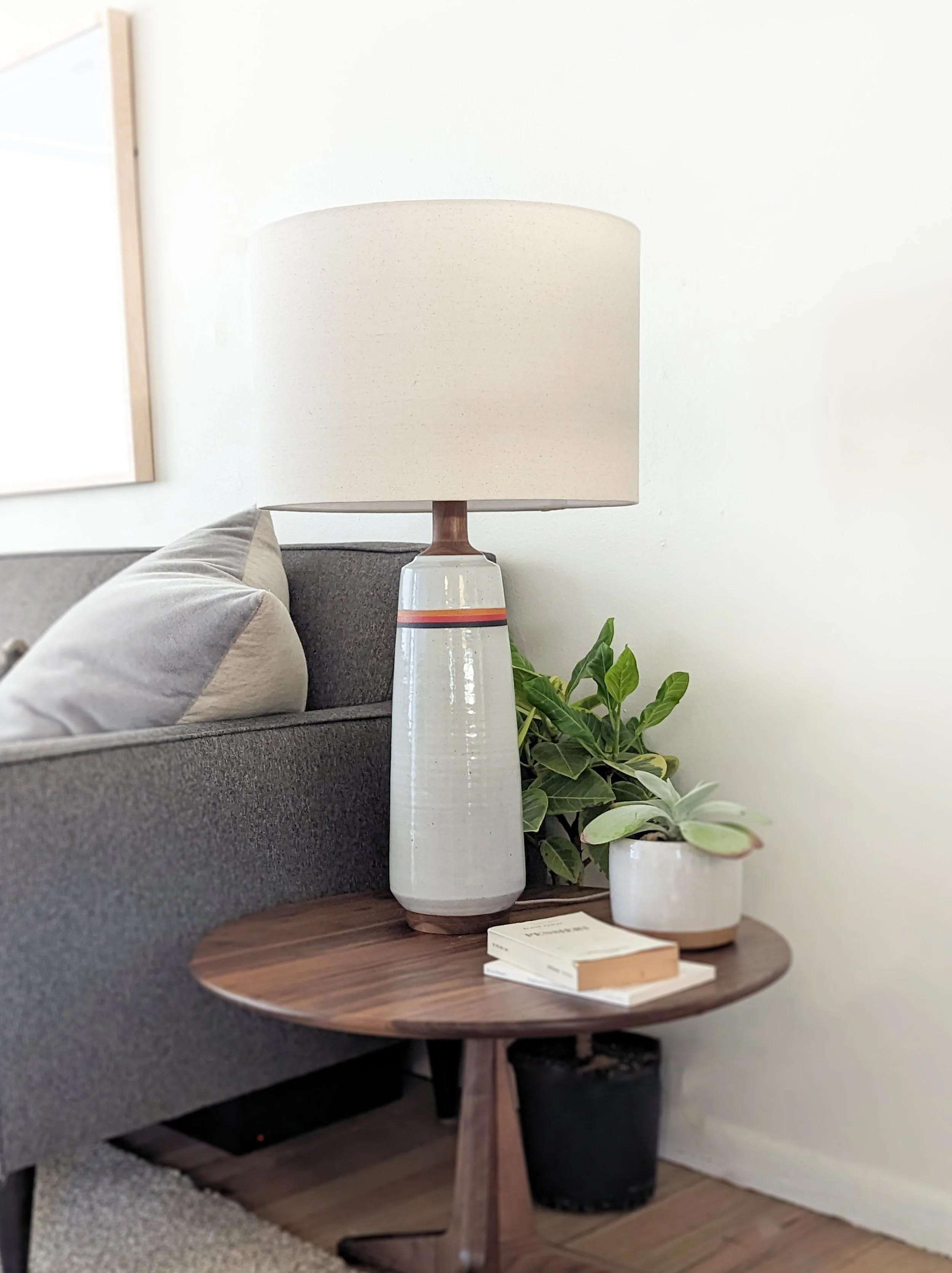 Tall and sculptural, this modern lamp is flexible and timeless in design. One of our larger table lamps, so this one fits well on a slightly larger side table, or on a living room console.
