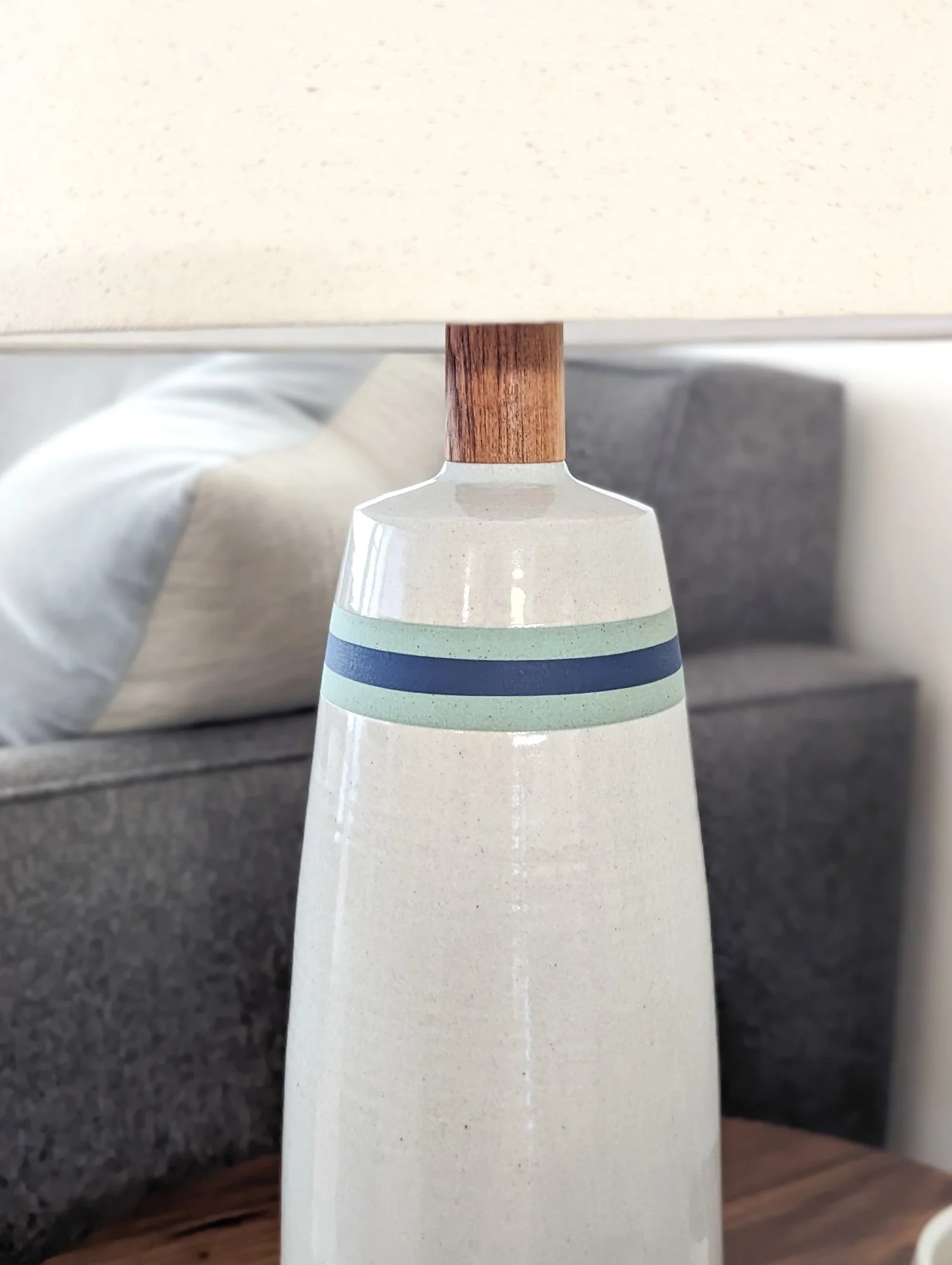 A fully handmade modern table lamp, hand-thrown white stoneware base, finished with a clear gray glaze and hand-brushed underglazes. Hand turned solid black walnut stem, base, and finial. Turned on a lathe to fit the clay lines perfectly. Fabric cord and high end components and 100% cotton shade included.
