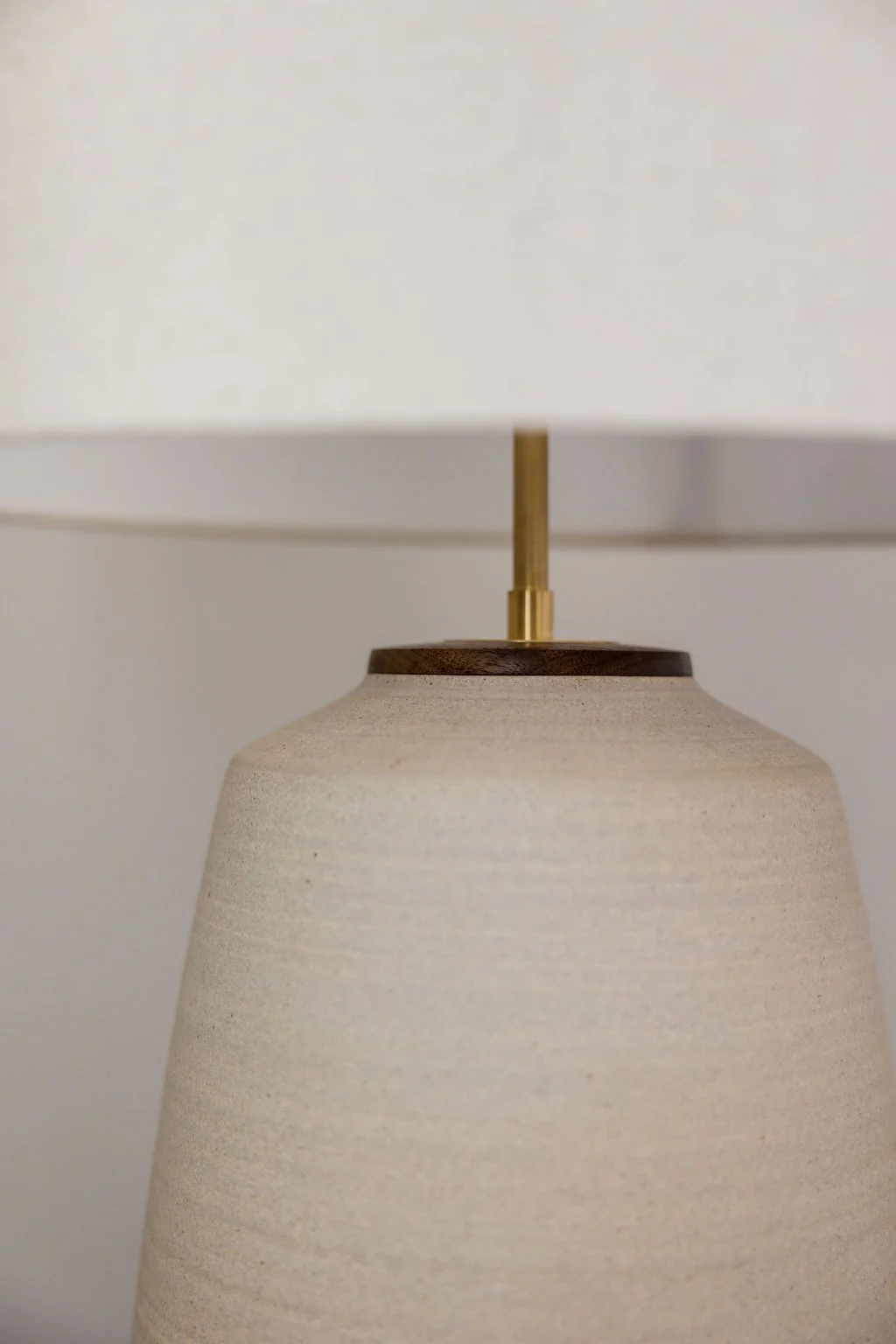 A fully handmade table lamp made exclusively for Brooke Wagner Design. Hand turned solid white oak base and brass neck. The speckled oatmeal shade was designed specifically for this lamp, and is meant to draw a similar texture from that in the glaze. Custom designed fabric cord and the best available electrical components.