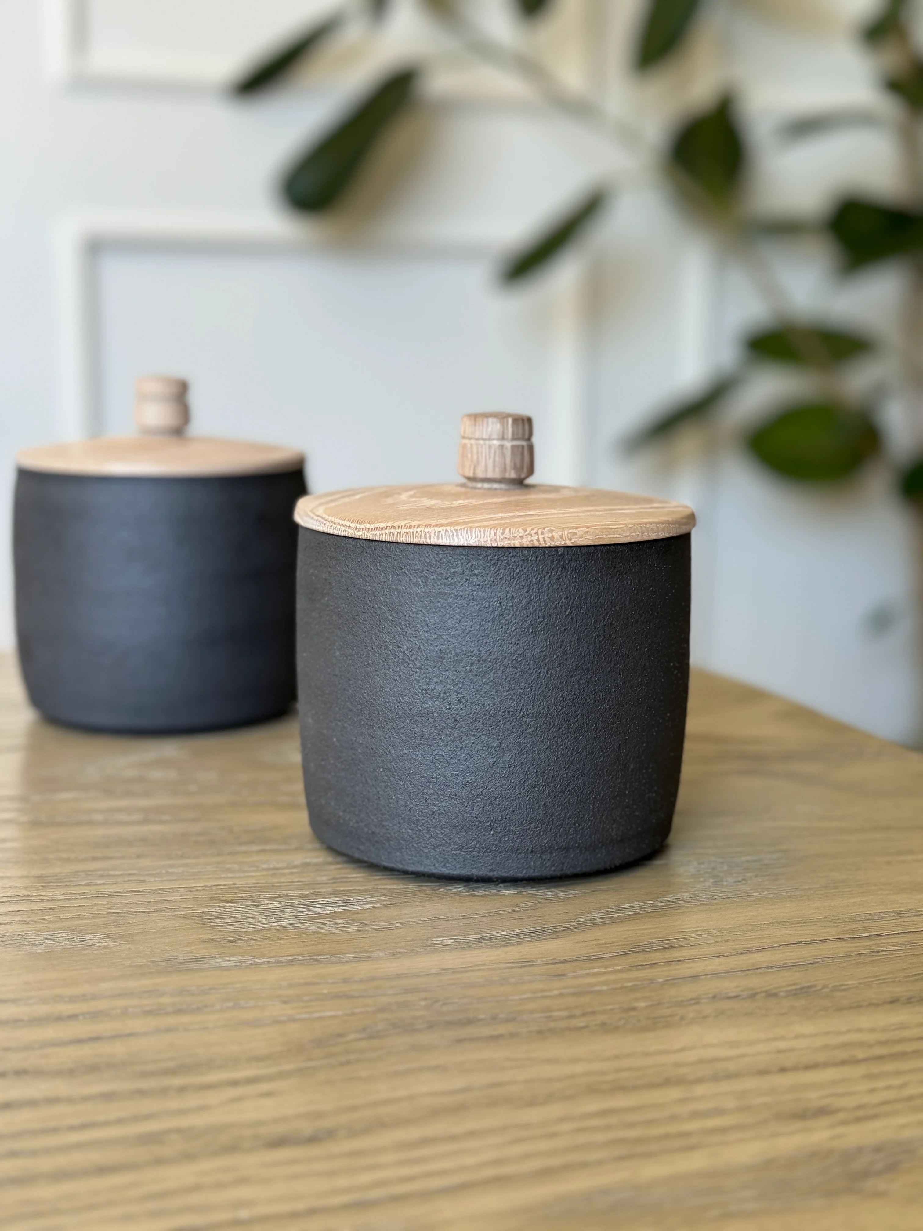 A Palo Santo scented soy wax candle made in collaboration with Brooke Wagner Design. Hand-thrown on the potters wheel and finished with a glossy speckled white interior. A solid wood hand-turned lid completes the modern look. Keep the vessel after use and enjoy as a planter or valuables jar.Â
