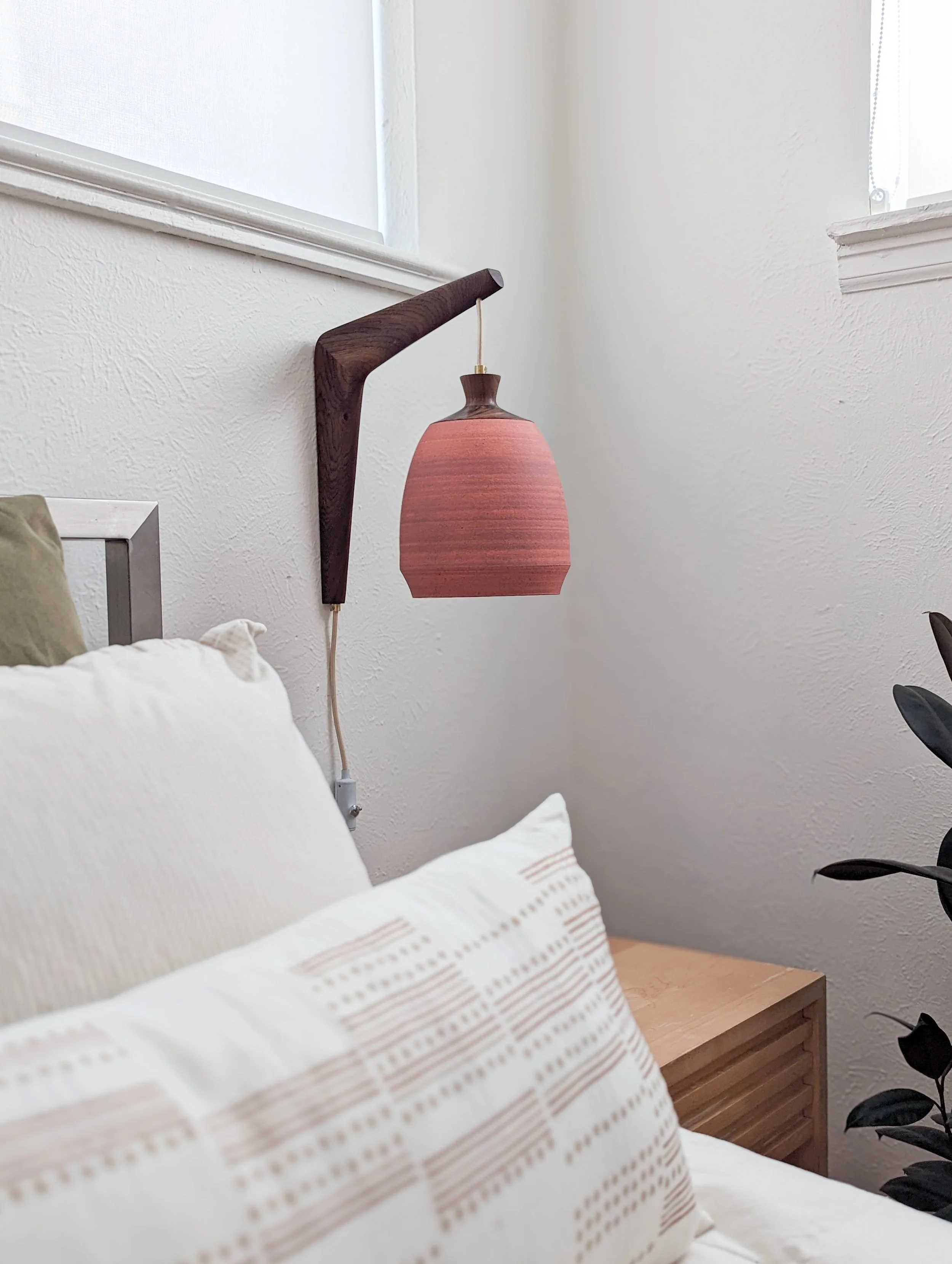 This wheel-thrown stoneware sconce is finished with a solid walnut, handmade mount. A fabric wrapped cord and inline on/off switch completes this sculptural fixture.