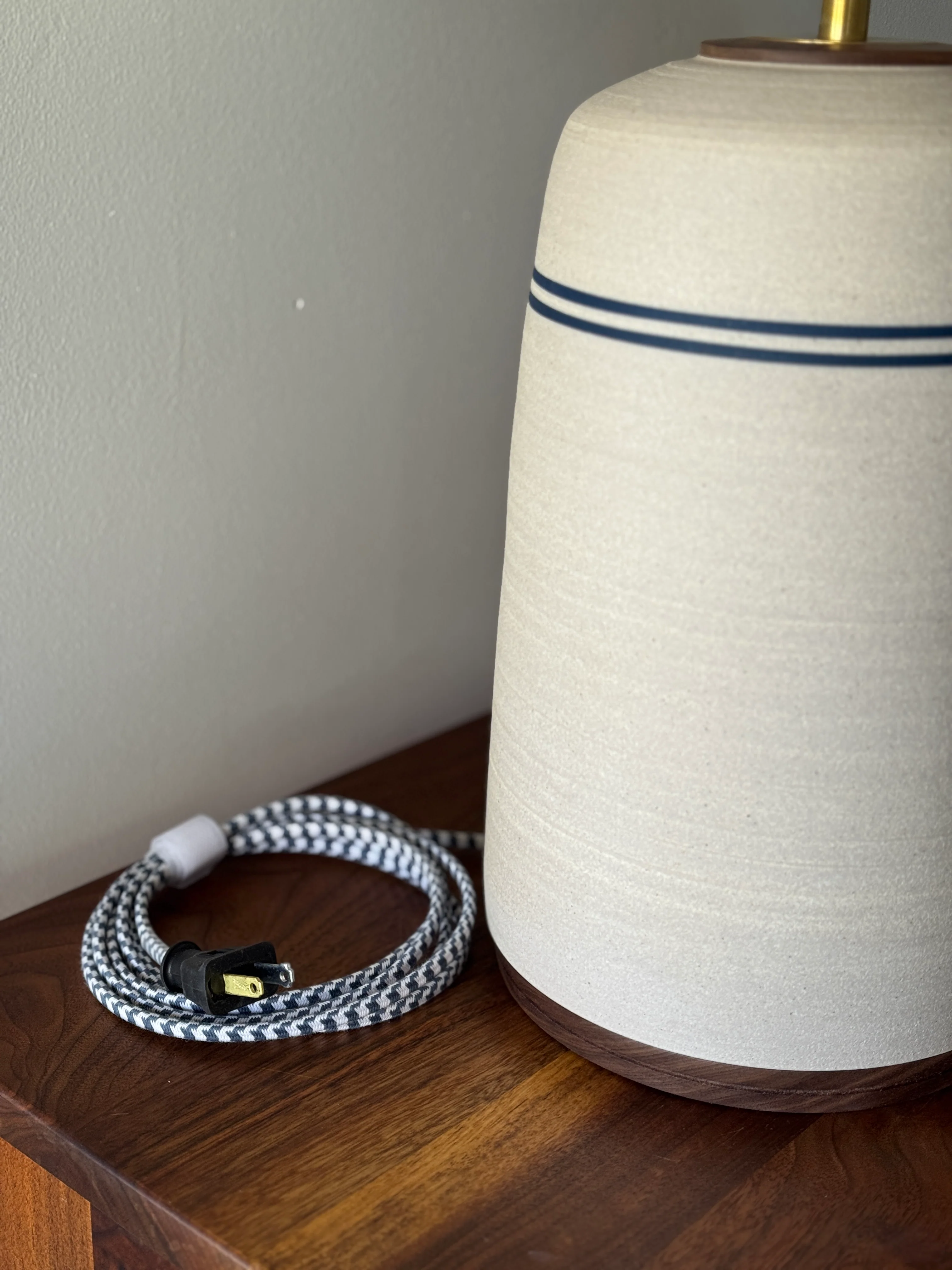 A one-of-a-kind lamp! With walnut and brass accents, and hand-thrown ceramic body, this functional work of art is a modern addition to any space. The striped stoneware body is then topped with an oatmeal shade.