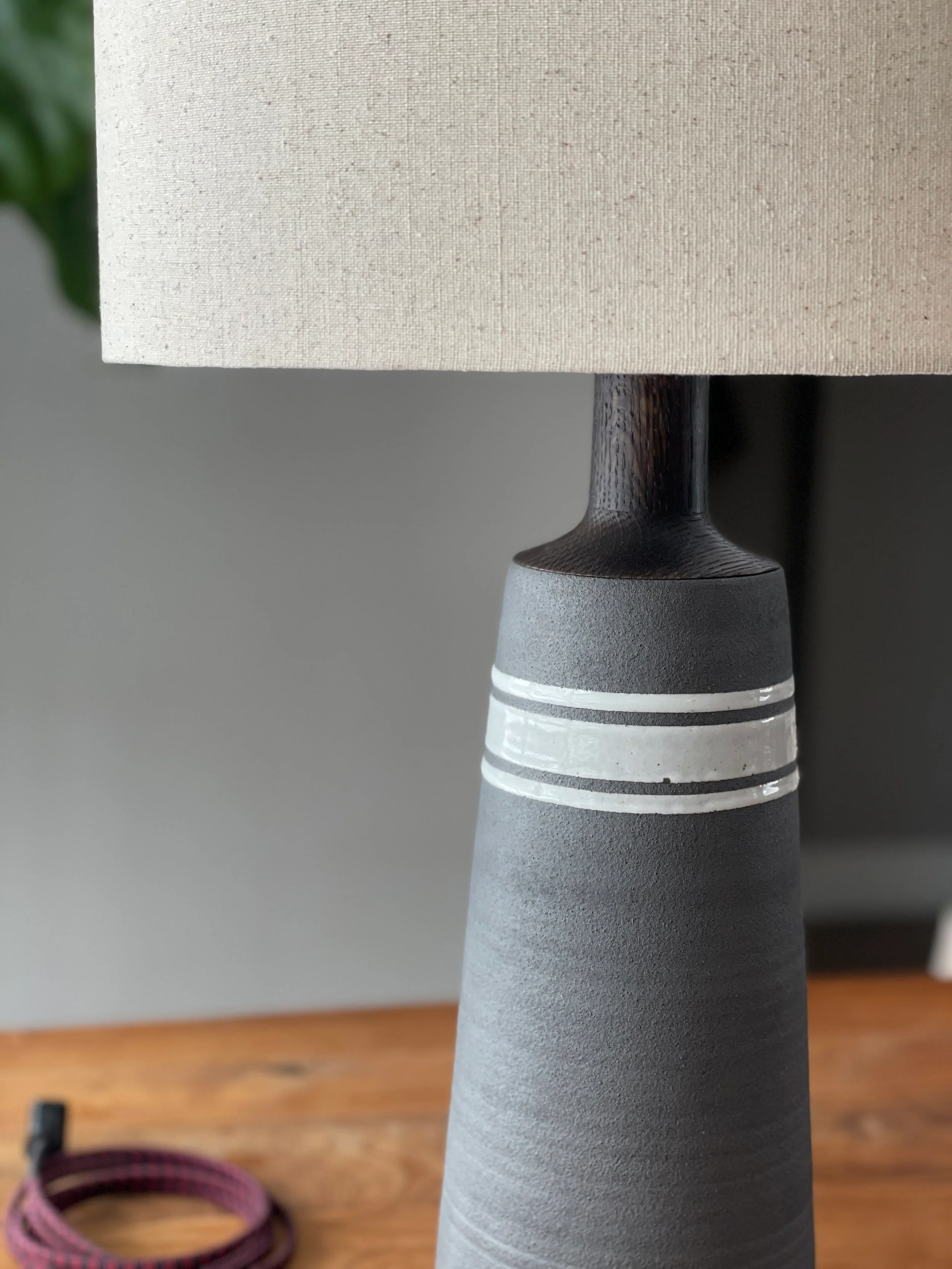 Perfectly proportioned, this stunning modern table lamp brings life to your space. Its sophisticated silhouette and detailed shou sugi ban oak neck make it a true statement. The moodiest of lamps that we offer.Â